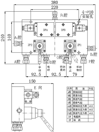 1、自動回路:將手動轉(zhuǎn)閥ZF1的手柄扳到停止位置,手動轉(zhuǎn)閥ZF2的手柄扳到電動位置,壓縮空氣進入電磁換向閥DFA、DFB的壓力腔(進氣腔),并密封在壓力腔內(nèi),左、右工作腔與排氣腔接通。